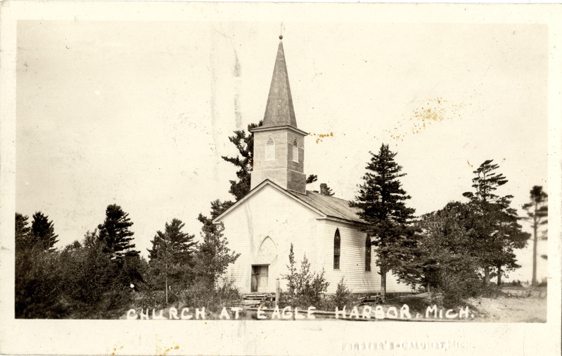 View of the Holy Redeemer Catholic Church at Eagle Harbor, Michigan. Printed on front: "Church at Eagle Harbor, Mich." Embossed on front: "Forster's, Calumet, Mich." Handwritten on back: "Eagle Harbor, built by Bhp. Baraga in 1845? History of Marq. Diocese. Page 241 reads Fr. Baraga paid 1st visit to Eagle Harbor in Jan. 1847."