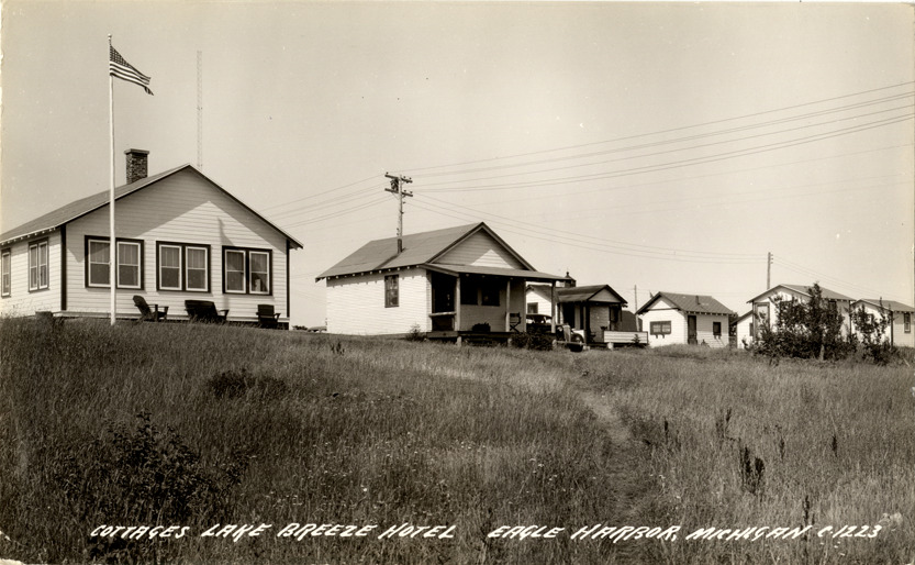 View of cottages at the Lake Breeze Resort in Eagle Harbor, Michigan. Printed on front: "Lake Breeze cottages, Eagle Harbor, Mich." Printed on back: "All rights reserved. The L.L. Cook Co., Milwaukee."