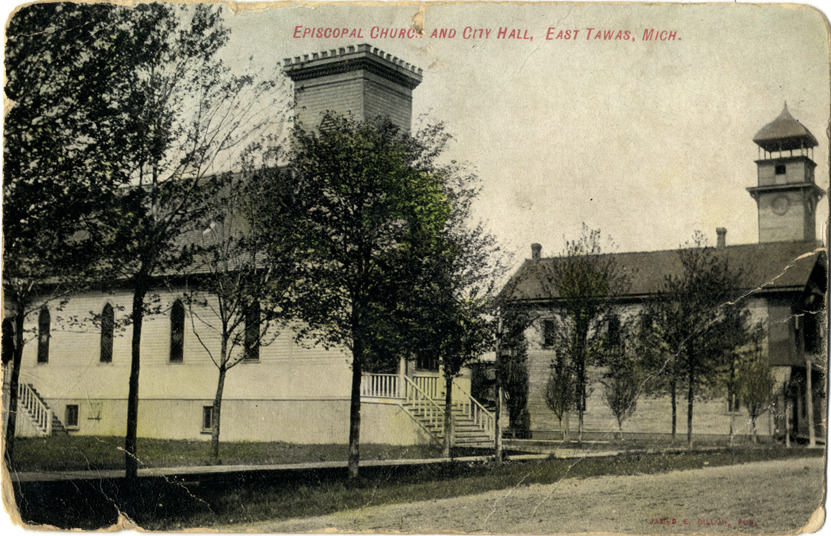 View of the Episcopal church and City Hall in East Tawas, Michigan. Printed on front: "Episcopal church and City Hall. East Tawas, Mich. James E. Dillon, pub." Handwritten on back: "I am having a good time."