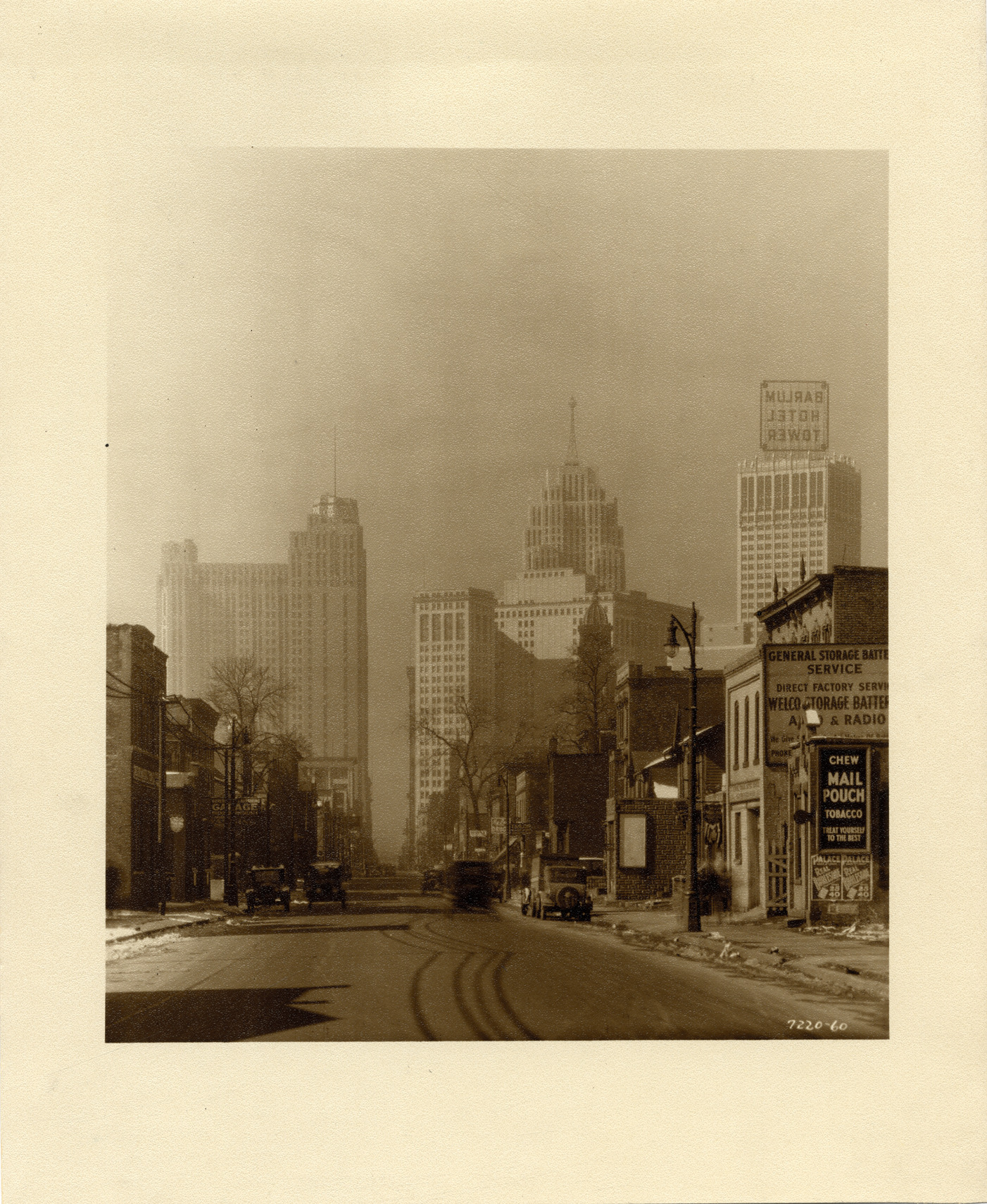 Distant view of the Union Guardian Building from Congress Street. Commercial buildings and cars in foreground; Penobscot Building is partially visible in background. The Union Guardian building was also known as the Guardian Building and the Union Trust Building. Stamped on back: "Grossman Knowling Lehr. 400 Marquette Bldg., Detroit, Michigan. File number 60." Handwritten on back: "View west on Congress St."