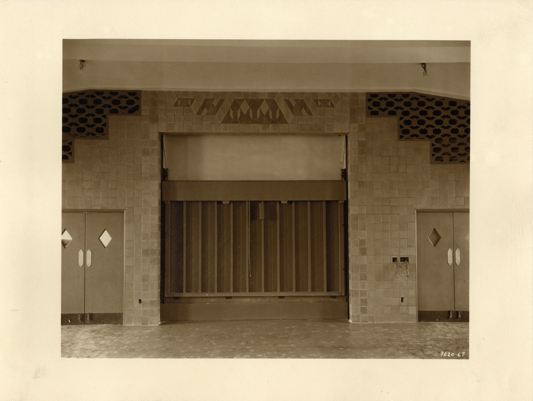 View of retracted folding stage and motion picture screen in the dining room on the 32nd floor of the Union Guardian Building. The building is also known as the Guardian Building and the Union Trust Building. Stamped on back: "Grossman Knowling Lehr, 400 Marquette Bldg., Detroit, Michigan. File number 67." Handwritten on back: "Stage, dining room, 32nd floor."