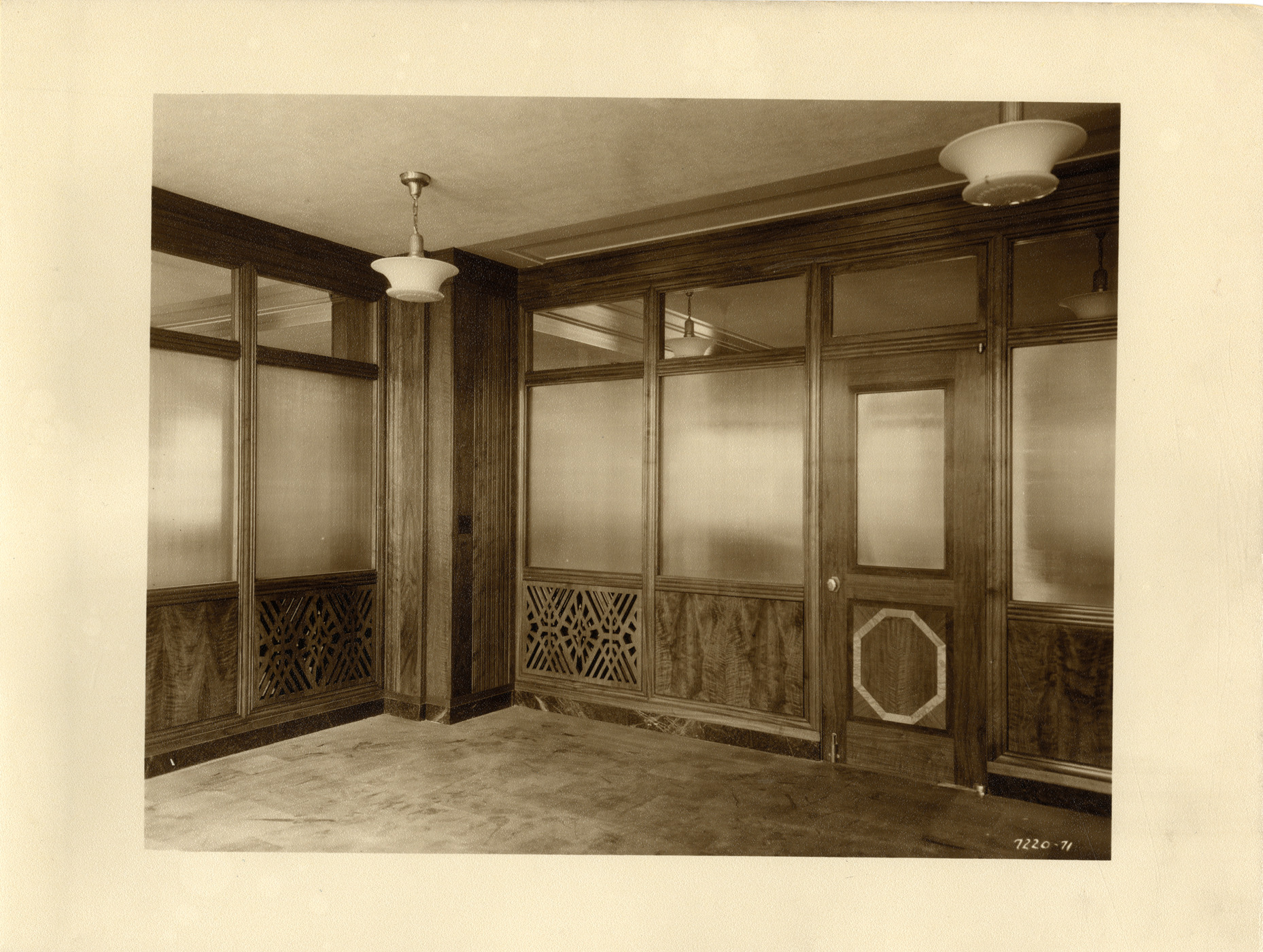 View of office partitions and door on the 11th floor of the Union Guardian Building. The building is also known as the Guardian Building and the Union Trust Building. Stamped on back: "Grossman Knowling Lehr, 400 Marquette Bldg., Detroit, Michigan. File number 71." Handwritten on back: "Office partitions, 11th floor."