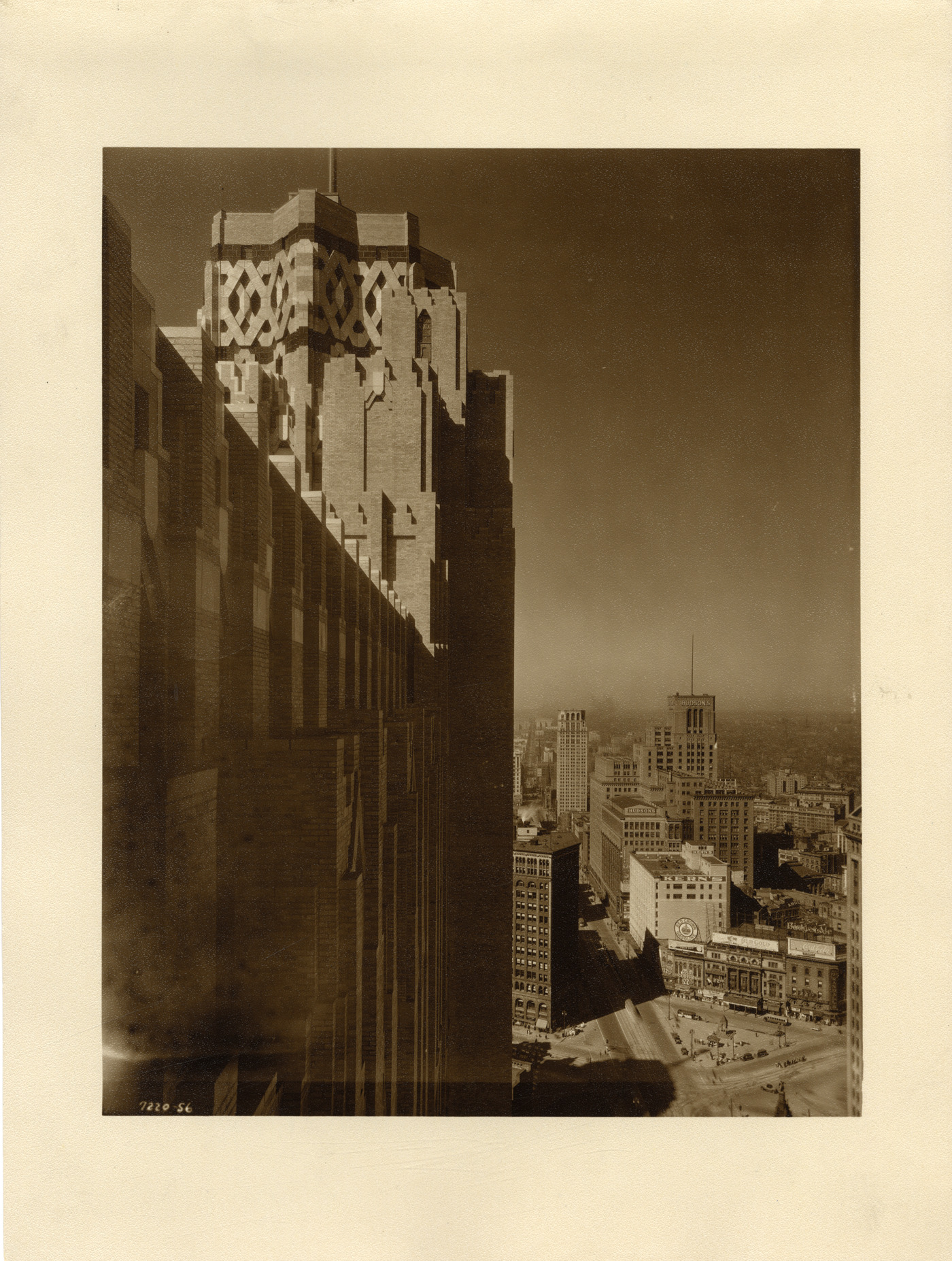 Close-up view of south tower of the Union Guardian Building. Hudson's department store in background. The Union Guardian building was also known as the Guardian Building and the Union Trust Building. Stamped on back: "Grossman Knowling Lehr. 400 Marquette Bldg., Detroit, Michigan. File number 56." Handwritten on back: "Looking north up Woodward Ave. from so. tower U.T. Bldg."