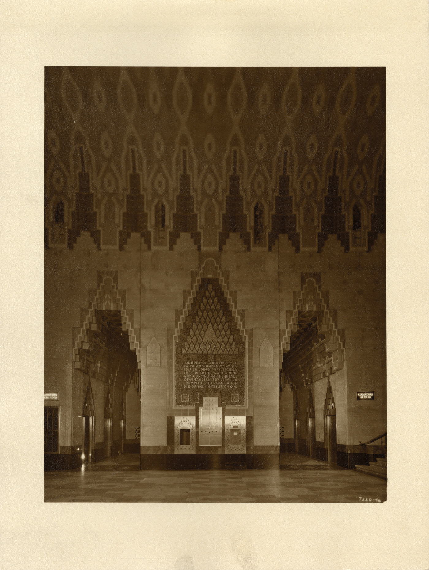View of the express and local elevator lobbies on the east side of the main lobby in the Union Guardian Building. The building is also known as the Guardian Building and the Union Trust Building. Stamped on back: "Grossman Knowling Lehr, 400 Marquette Bldg., Detroit, Michigan. File number 46." Handwritten on back: "Main lobby, east side. Express & local elevator lobbies."