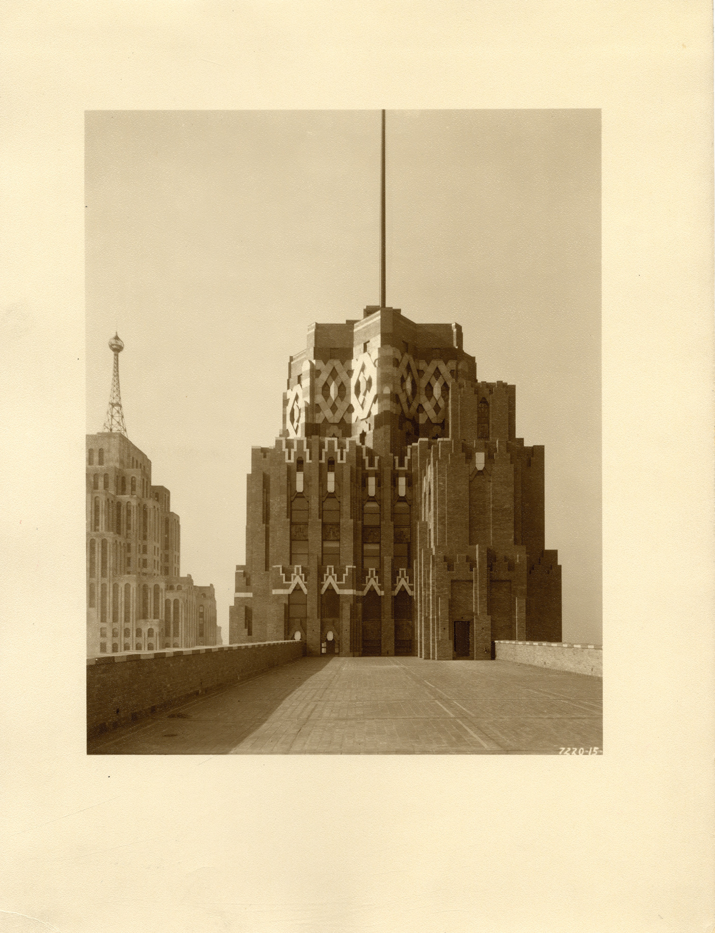 View of the north tower from the main roof of the Union Guardian Building. The building is also known as the Guardian Building and the Union Trust Building. Stamped on back: "Grossman Knowling Lehr, 400 Marquette Bldg., Detroit, Michigan. File number 15." Handwritten on back: "North tower from main roof, 32nd floor."