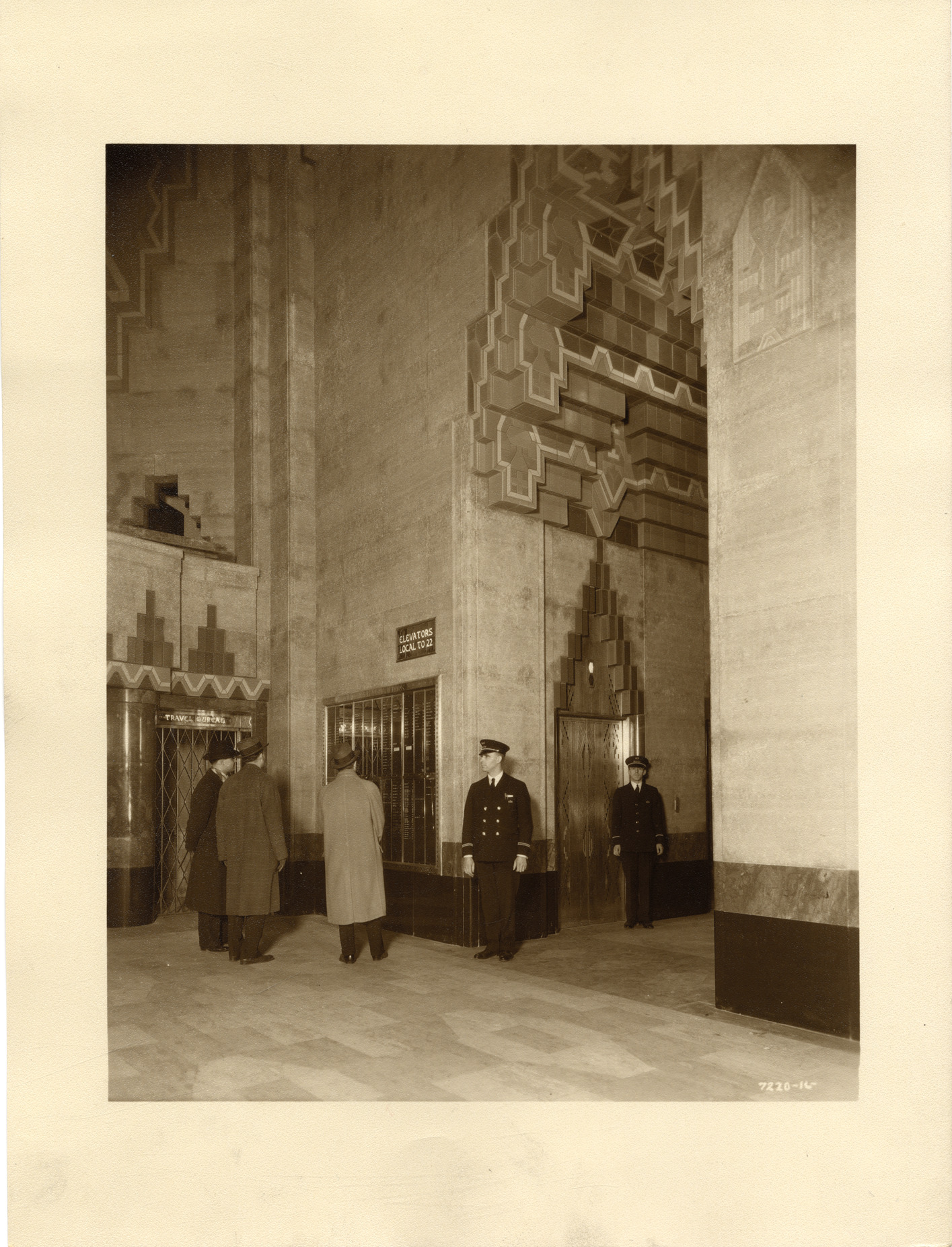View of the elevator lobby off the main lobby in the Union Guardian Building. Several men look at building directory; two security guards stand nearby. The building is also known as the Guardian Building and the Union Trust Building. Stamped on back: "Grossman Knowling Lehr, 400 Marquette Bldg., Detroit, Michigan. File number 16." Handwritten on back: "Main lobby."