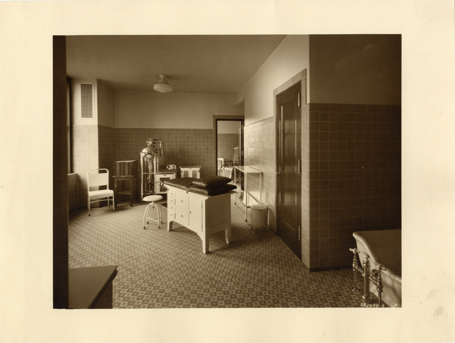 View of the infirmary on the 9th floor of the Union Guardian Building. Room contains cabinets, bathtub, seating and an examination table. The building is also known as the Guardian Building and the Union Trust Building. Stamped on back: "Grossman Knowling Lehr, 400 Marquette Bldg., Detroit, Michigan. File number 19-A." Handwritten on back: "Infirmary, 9th fl."