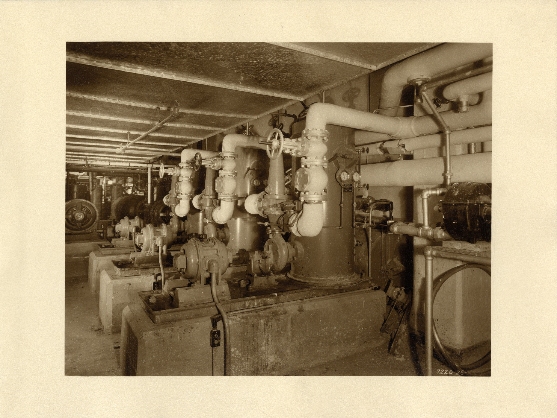 View of vacuum pumps in the 3rd basement of the Union Guardian Building. The building is also known as the Guardian Building and the Union Trust Building. Stamped on back: "Grossman Knowling Lehr, 400 Marquette Bldg., Detroit, Michigan. File number 25." Handwritten on back: "Vacuum pumps, 3rd bsmt."