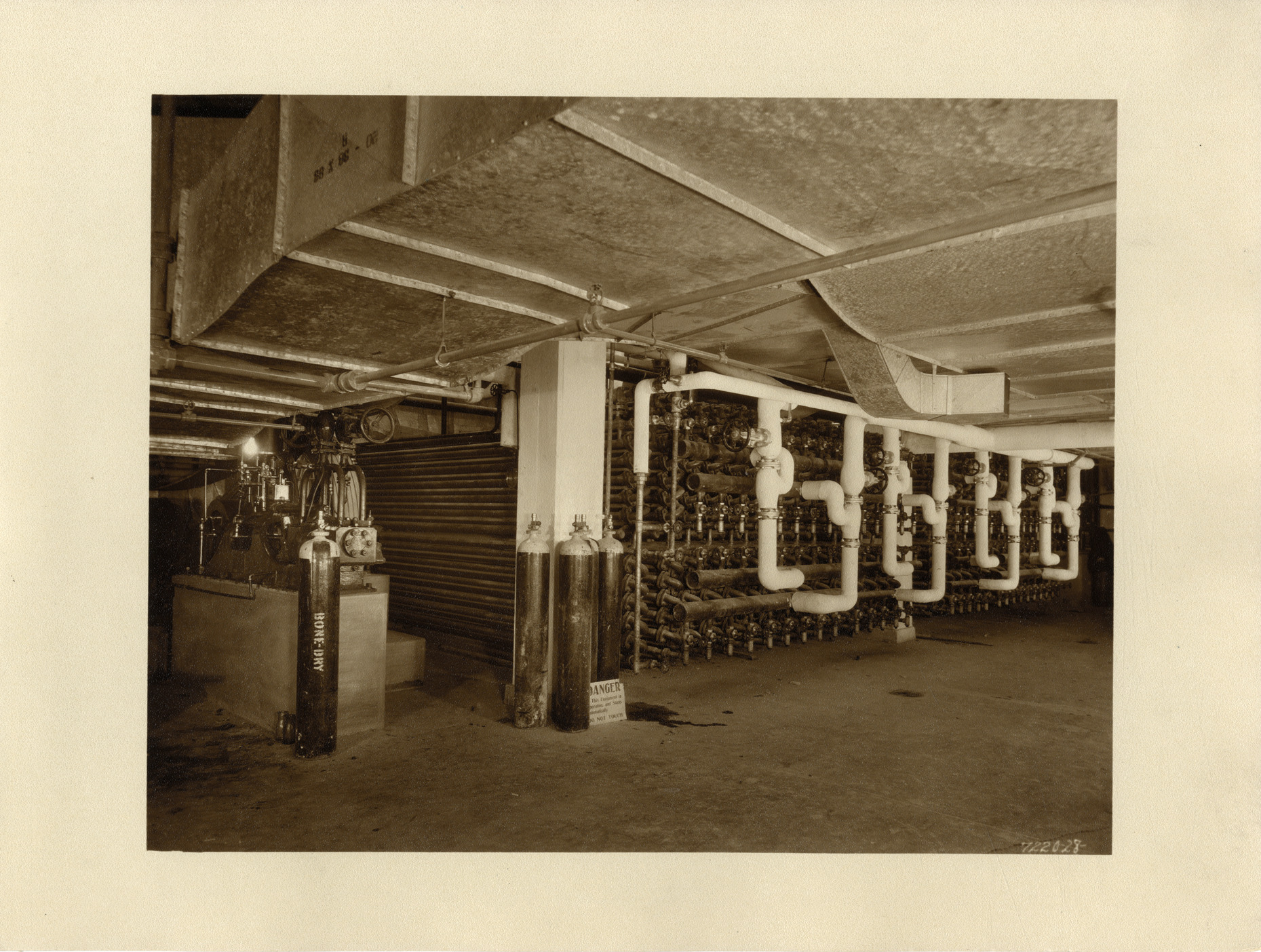 View of carbon dioxide compressor and air conditioning system in the 3rd basement of the Union Guardian Building. The building is also known as the Guardian Building and the Union Trust Building. Stamped on back: "Grossman Knowling Lehr, 400 Marquette Bldg., Detroit, Michigan. File number 28." Handwritten on back: "CO2 compressor for Dr. Water. Main condenser, air cond. system, 3rd bsmt."
