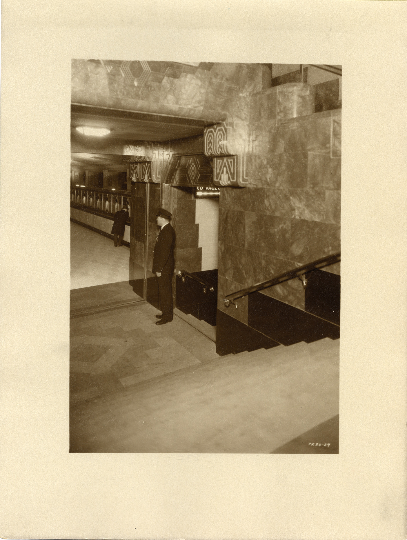 View of a security guard standing at the entrance to the safe deposit vaults in the Union Guardian Building. Stairs in foreground; teller windows in background. The building is also known as the Guardian Building and the Union Trust Building. Stamped on back: "Grossman Knowling Lehr, 400 Marquette Bldg., Detroit, Michigan. File number 29." Handwritten on back: "Entrance to safe dep. vaults from m. lobby."