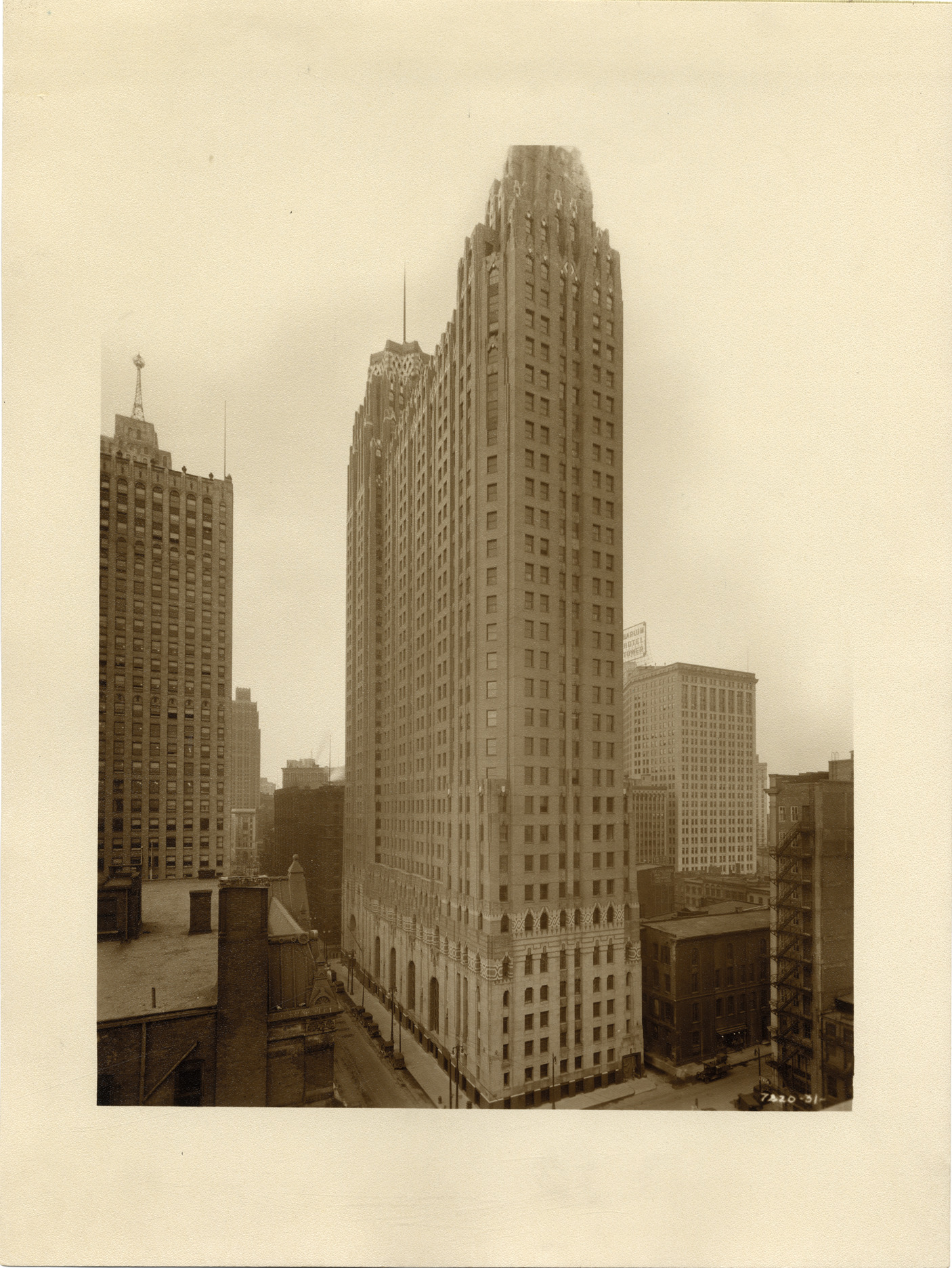 View of the Union Guardian Building. The building is also known as the Guardian Building and the Union Trust Building. Stamped on back: "Grossman Knowling Lehr, 400 Marquette Bldg., Detroit, Michigan. File number 31." Handwritten on back: "South Larned St. West, Griswold St. elevations."