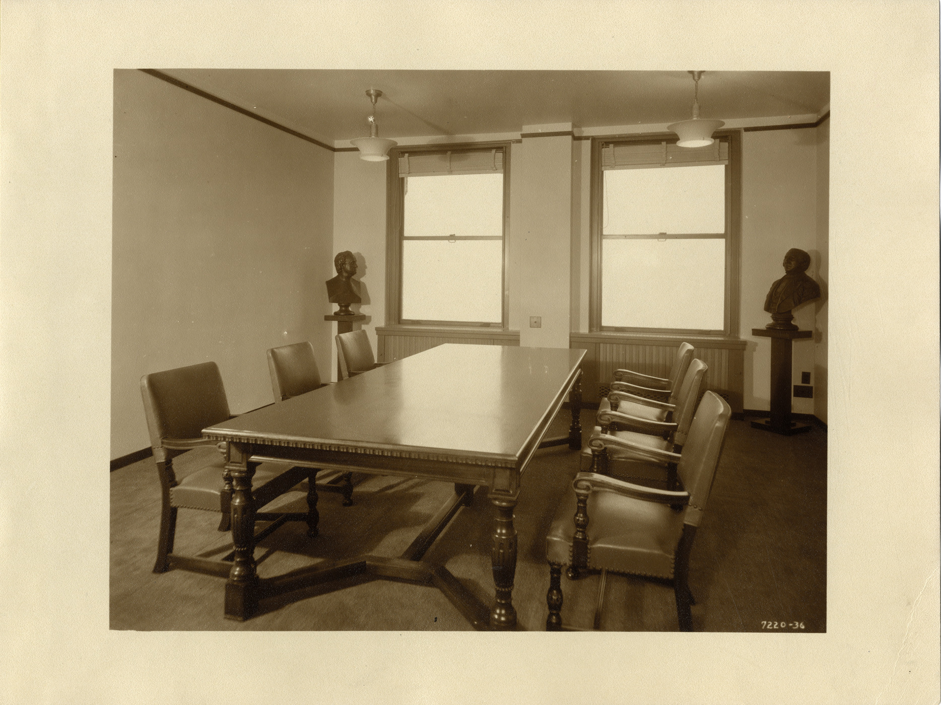 View of chairs around a conference table in the library on the 30th floor of the Union Guardian Building. Portrait busts displayed in background. The building is also known as the Guardian Building and the Union Trust Building. Stamped on back: "Grossman Knowling Lehr, Inc. 400 Marquette Bldg., Detroit, Michigan. File number 36." Handwritten on back: "Library. Attorneys offices, 30th fl."