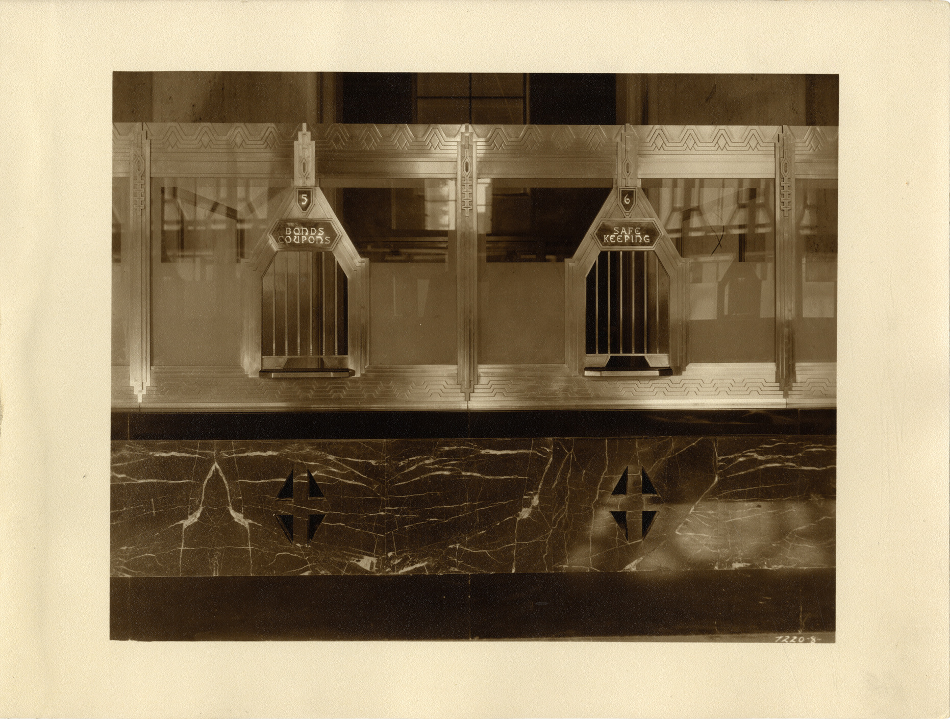 View of bank teller windows on the main banking floor of the Union Guardian Building. Signs over windows read: "5, Bonds, coupons" and "6, Safe keeping." The building is also known as the Guardian Building and the Union Trust Building. Stamped on back: "Grossman Knowling Lehr, 400 Marquette Bldg., Detroit, Michigan. File number 8." Handwritten on back: "Tellers cages, main banking floor."