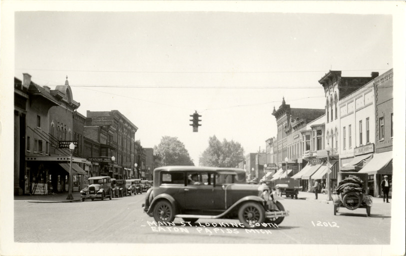Favorite this☆ Automobiles on Main Street, Eaton Rapids, Michigan Description: View of cars on Main St. in Eaton Rapids, Michigan. Commercial buildings in background. Printed on front: "Main St. looking south, Eaton Rapids, Mich. 12012." Details Resource ID: bh012909 Subject: Automobiles--Michigan--Eaton Rapids Streets--Michigan--Eaton Rapids Commercial buildings--Michigan--Eaton Rapids Photographic prints Postcards Date Issued: Unknown year Format: 1 postcard ; 3.5 x 5.5 in. Member of: Burton Historical Collection Filing Location: M/Localities-Eaton Rapids Rights: Physical rights are retained by DPL. Copyright is retained in accordance with U.S. copyright laws.