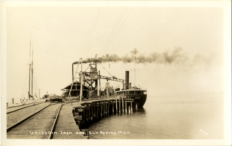 Favorite this☆ Ship unloading iron ore, Elk Rapids, Michigan Description: View of the ship "Cadillac of Grand Island" unloading iron ore at dock in Elk Rapids, Michigan. Printed on front: "Unloadin [sic] iron ore, Elk Rapids, Mich. Beebe." Details Resource ID: bh012918 Creator: Beebe, Edward L. Subject: Ore carriers--Michigan--Elk Rapids Iron ores--Michigan--Elk Rapids Photographers--Michigan Photographic prints Postcards Date Issued: Unknown year Format: 1 postcard ; 3.5 x 5.5 in. Member of: Burton Historical Collection Filing Location: M/Localities-Elk Rapids Rights: Physical rights are retained by DPL. Copyright is retained in accordance with U.S. copyright laws.