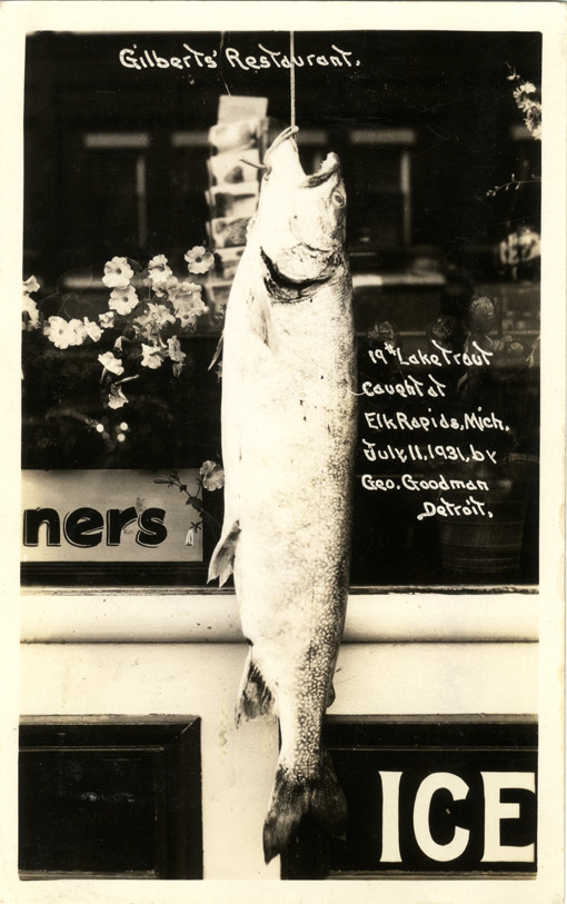 View of a 19 pound trout caught by George Goodman in Elk Rapids, Michigan. Trout is displayed in front of Gilbert's Restaurant. Printed on front: "Gilbert's Restaurant. 19# lake trout caught at Elk Rapids, Mich., July 11, 1931 by Geo. Goodman, Detroit." Handwritten on back: "You can cook this one for dinner. Herb." Card is postmarked August 18, 1931.