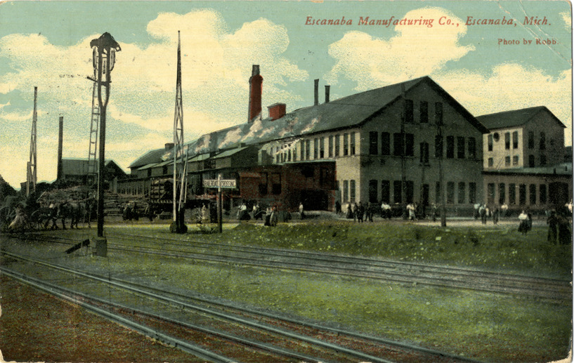 Favorite this☆ Escanaba Manufacturing Company, Escanaba, Michigan Description: View of the Escanaba Manufacturing Company factory at Escanaba, Michigan. Printed on front: "Escanaba Manufacturing Co., Escanaba, Mich. Photo by Robb." Handwritten on back: "Fine place." Card is postmarked June 14, 1912. Details Resource ID: bh012953 Creator: Robb Subject: Factories--Michigan--Escanaba Postcards Date Issued: 1912 (year approximate) Format: 1 postcard : col. ; 3.5 x 5.5 in. Member of: Burton Historical Collection Filing Location: M/Localities-Escanaba Rights: Physical rights are retained by DPL. Copyright is retained in accordance with U.S. copyright laws.
