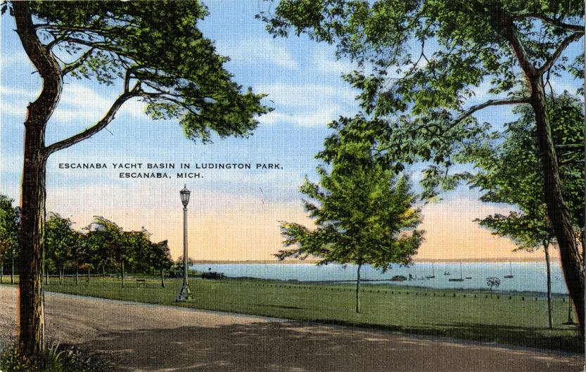 View of the yacht basin at Ludington Park in Escanaba, Michigan. Printed on front: "Escanaba yacht basin in Ludington Park, Escanaba, Mich." Printed on back: "Escanaba's yacht basin in Ludington Park is a place to delight the yachtsman's heart. Delightfully situated on one of the best deep water harbors of the Great Lakes on the shores of Little Bay de Noquet. There are broad sand beaches stretching for miles in either direction and here you find a modern city with metropolitan conveniences in the heart of a great vacationland. Made in U.S.A. by E.C. Kropp Co., Milwaukee, Wis."