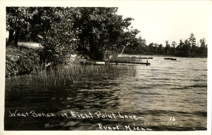 Favorite this☆ West Beach, Eight Point Lake, Evart, Michigan Description: View of West Beach at Eight Point Lake in Evart, Michigan. Printed on front: "West Beach, Eight Point Lake, Evart, Mich." Details Resource ID: bh012965 Subject: Lakes--Michigan--Evart Beaches--Michigan--Evart Photographic prints Postcards Date Issued: Unknown year Format: 1 postcard ; 3.5 x 5.5 in. Member of: Burton Historical Collection Filing Location: M/Localities-Evart Rights: Physical rights are retained by DPL. Copyright is retained in accordance with U.S. copyright laws.