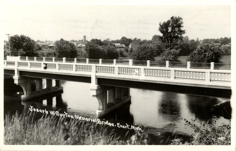 Favorite this☆ Joseph W. Gurton Memorial Bridge, Evart, Michigan Description: View of the Joseph W. Gurton Memorial Bridge in Evart, Michigan. Printed on front: "Joseph W. Gurton Memorial Bridge, Evart, Mich." Details Resource ID: bh012968 Subject: Bridges--Michigan--Evart Photographic prints Postcards Date Issued: Unknown year Format: 1 postcard ; 3.5 x 5.5 in. Member of: Burton Historical Collection Filing Location: M/Localities-Evart Rights: Physical rights are retained by DPL. Copyright is retained in accordance with U.S. copyright laws.