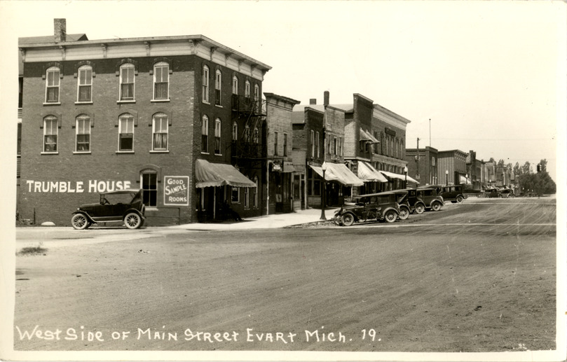 Favorite this☆ Main Street, Evart, Michigan Description: View of cars parked in front of commercial buildings along Main St. in Evart, Michigan. Trumble House in foreground. Printed on front: "West side of Main Street, Evart, Mich." Details Resource ID: bh012971 Subject: Streets--Michigan--Evart Commercial buildings--Michigan--Evart Automobiles--Michigan--Evart Photographic prints Postcards Date Issued: Unknown year Format: 1 postcard ; 3.5 x 5.5 in. Member of: Burton Historical Collection Filing Location: M/Localities-Evart Rights: Physical rights are retained by DPL. Copyright is retained in accordance with U.S. copyright laws.