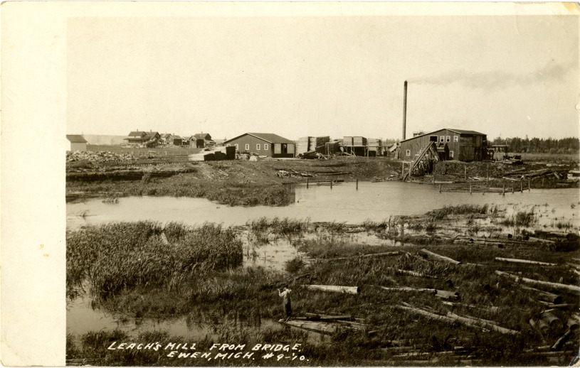 Favorite this☆ Leach lumber mill, Ewen, Michigan Description: View of the Leach lumber mill in Ewen, Michigan. Printed on front: "Leach's Mill from bridge, Ewen, Mich., #9-10." Details Resource ID: bh012976 Subject: Planing-mills--Michigan--Ewen Lumber trade--Michigan--Ewen Photographic prints Postcards Date Issued: Unknown year Format: 1 postcard ; 3.5 x 5.5 in. Member of: Burton Historical Collection Filing Location: M/Localities-Ewen Rights: Physical rights are retained by DPL. Copyright is retained in accordance with U.S. copyright laws.