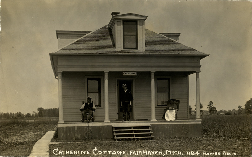 Favorite this☆ Catherine Cottage, Fair Haven, Michigan Description: View of two men and a woman posing in front of Catherine Cottage in Fair Haven, Michigan. Wooden-frame house has covered entry porch. Printed on front: "Catherine Cottage, Fair Haven, Mich. 1184, Flower photo." Details Resource ID: bh012982 Creator: Flower, Clarence William Subject: Vacation homes--Michigan--Fair Haven Wooden-frame houses--Michigan--Fair Haven Photographers--Michigan Photographic prints Postcards Date Issued: Unknown year Format: 1 postcard ; 3.5 x 5.5 in. Member of: Burton Historical Collection Filing Location: M/Localities-Fair Haven Rights: Physical rights are retained by DPL. Copyright is retained in accordance with U.S. copyright laws.