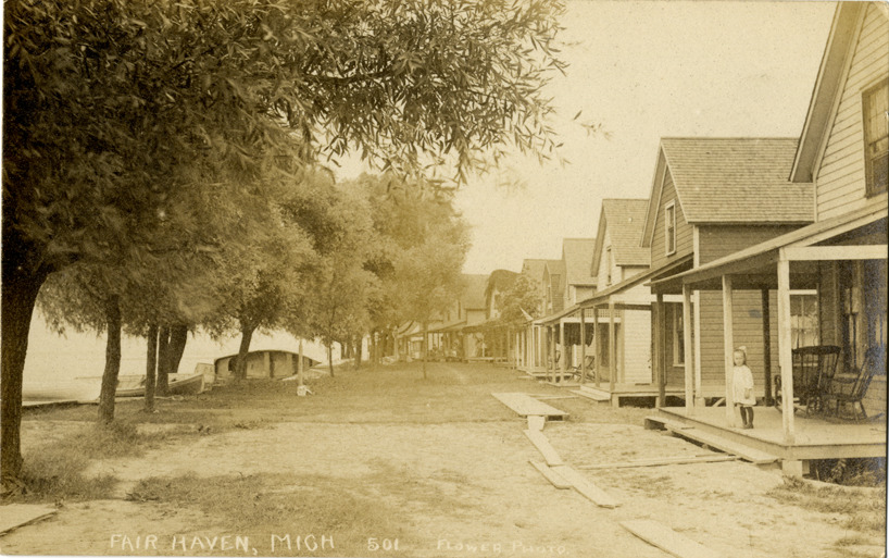 Favorite this☆ Cottages, Fair Haven, Michigan Description: View of wooden-frame cottages in Fair Haven, Michigan. Rowboats under trees on left. Printed on front: "Fair Haven, Mich. 501, Flower photo." Details Resource ID: bh012985 Creator: Flower, Clarence William Subject: Vacation homes--Michigan--Fair Haven Wooden-frame houses--Michigan--Fair Haven Photographers--Michigan Photographic prints Postcards Date Issued: Unknown year Format: 1 postcard ; 3.5 x 5.5 in. Member of: Burton Historical Collection Filing Location: M/Localities-Fair Haven Rights: Physical rights are retained by DPL. Copyright is retained in accordance with U.S. copyright laws.