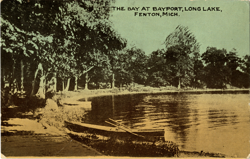 View of the bay at Bayport, Long Lake in Fenton, Michigan. Rowboat in foreground. Printed on front: "The bay at Bayport, Long Lake, Fenton, Mich." Handwritten on back: "Dear Friend, A line to tell you we still live in Fenton. Enjoyed a pleasant afternoon with Mr. and Mrs. D. at this landing. Wish I could have seen you there too. Your true friend, Lena Goodfellow." Card is postmarked September 10.