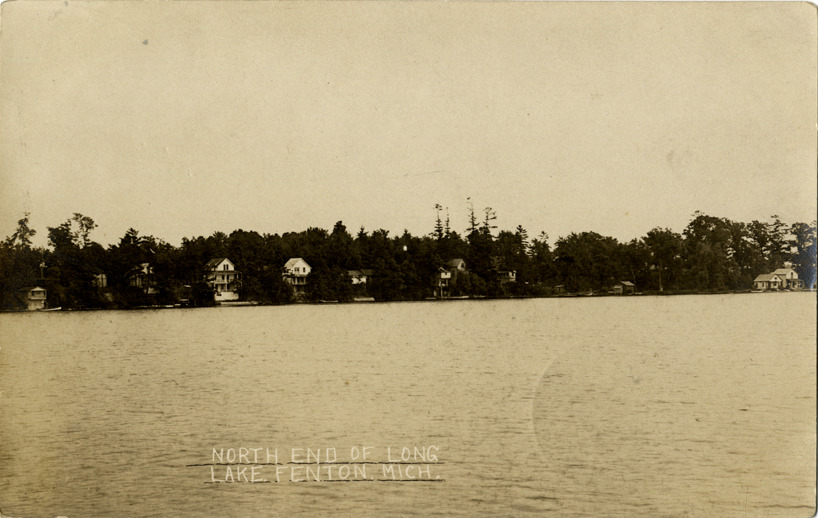 View of Long Lake in Fenton, Michigan. Cottages on shore in background. Printed on front: "North end of Long Lake, Fenton, Mich." Handwritten on back: "We received a card from Aunt [undecipherable] and they leave for Mich. this morn. She said she thought she would stop in [undecipherable]. I am going to write and tell what we had planned to do and maybe we will be there Sat. You might write Major & tell him about our plans & see if he will meet us in [undecipherable] We go to L. & stay with some of them one night. Mama." Card is postmarked January 18, 1919.