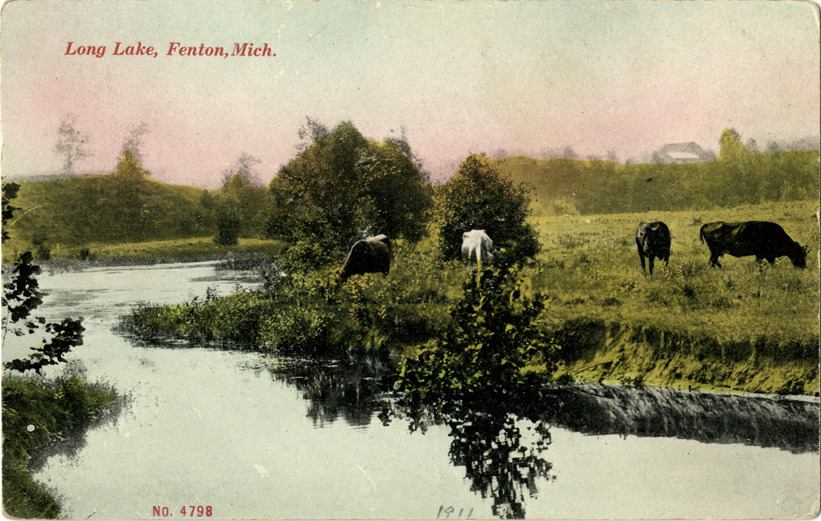 Favorite this☆ Cows grazing at Long Lake, Fenton, Michigan Description: View of cows grazing at Long Lake at Fenton, Michigan. Printed on front: "Long Lake, Fenton, Mich. No. 4798." Handwritten on front: "1911." Details Resource ID: bh013007 Subject: Lakes--Michigan--Fenton Cows--Michigan--Fenton Postcards Date Issued: 1911 (year approximate) Format: 1 postcard : col. ; 3.5 x 5.5 in. Member of: Burton Historical Collection Filing Location: M/Localities-Fenton Rights: Physical rights are retained by DPL. Copyright is retained in accordance with U.S. copyright laws.