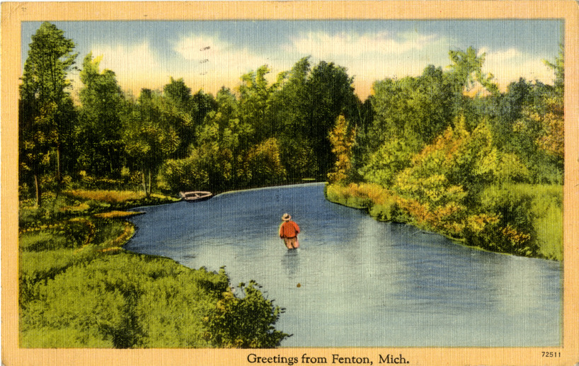 View of man wading in river in Fenton, Michigan. Printed on front: "Greetings from Fenton, Mich." Printed on back: "Tichnor quality views. Reg. U.S. Pat. Off. Made only by Tichnor Bros., Inc., Boston, Mass." Handwritten message on back. Card is postmarked May 9, 1946.