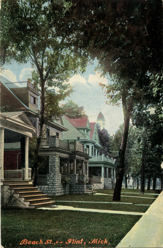 View of houses on Beach St. in Flint, Michigan. Printed on front: "Beach St., Flint, Mich." Handwritten on back: "Fenton, 8-5-09. Dear Friend, Mrs. Rogers, Will you please send me another crock of butter if you have it to spare. Yours truly, Mrs. Shaw." Card is postmarked August 5, 1909.
