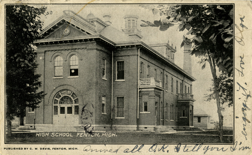 View of High School in Fenton, Michigan. Printed on front: "High School, Fenton, Mich. Published by C.M. Davis, Fenton, Mich." Handwritten on front: "Arrived all O.K. I tell you I'm enjoying it. Love, Olga." Card is postmarked August 13, 1907.