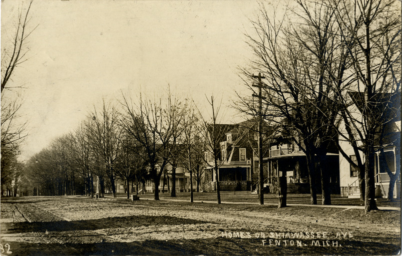 View of wooden-frame houses on Shiawassee Ave. in Fenton, Michigan. Printed on front: "Homes on Shiawassee Ave., Fenton, Michigan." Handwritten on back: "Dear Mrs. Rider, I believe your birthday is at hand or very soon. Best wishes I can assure you. Yours, Mark Gordon." Card is postmarked August 29, 1917.