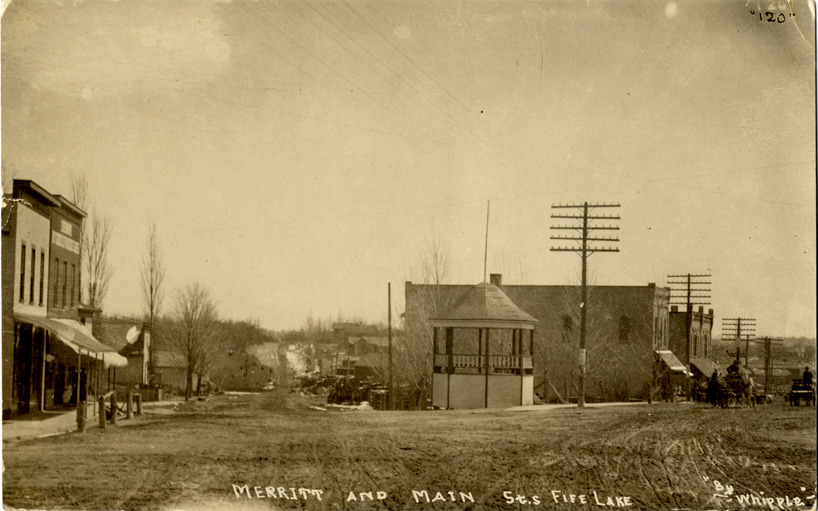 View of commercial buildings and a bandstand on Merritt St. and Main St. in Fife Lake, Michigan. Printed on front: "Merritt and Main Sts., Fife Lake. By Whipple." Handwritten on back: "Received your card today I goat [sic] your picture all right I goat [sic] mine taken Sunday will send you one will get them next Sunday. I am enjoying good health and hope you are all the same. Tom." Card is postmarked September 23, 1910.