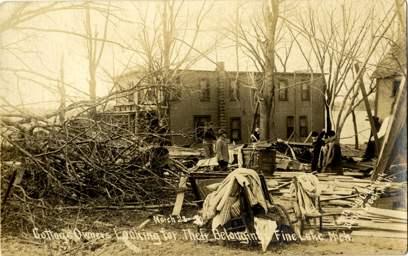 View of cottage owners looking through building debris during the aftermath of a tornado at Fine Lake, in Barry County, Michigan. Printed on front: "Cottage owners looking for their belongings, Fine Lake, Mich. March 28, 20. Photo by C.B. Funk, Battle Creek, Mich."