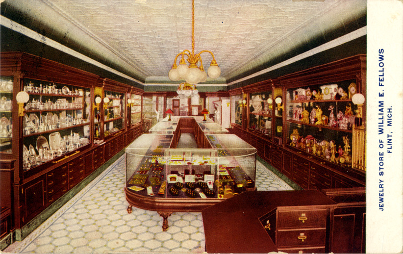 View of the interior of the William E. Fellows jewelry store in Flint, Michigan. Room is furnished with display cases and shelves. Printed on front: "Jewelry store of William E. Fellows, Flint, Mich." Printed on back: "The Christmas of 1908 will be the eleventh since my store was opened to the public, and I desire to thank you with thousands of others whose liberal patronage has made it possible to build up a trade seldom equaled in the retail jewelry business, also to announce that our holiday stock is now complete and you are invited to call and inspect same whether you desire to purchase or not. Yours respectfully, W.E. Fellows." Card is postmarked Dec. 2, 1908.