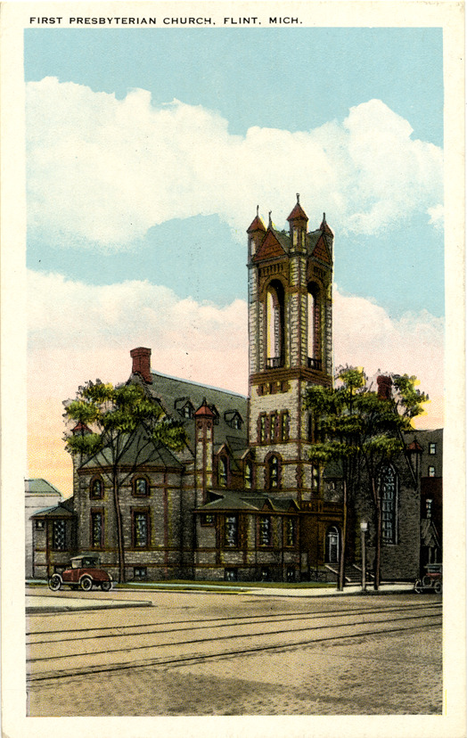 First Presbyterian Church, Flint, Michigan Description: View of the First Presbyterian Church in Flint, Michigan. Printed on front: "First Presbyterian Church, Flint, Mich." Printed on back: "Tichnor quality views." Details Resource ID: bh013091 Subject: Presbyterian church buildings--Michigan--Flint Postcards Publisher: Tichnor Brothers Date Issued: Unknown year Format: 1 postcard : col. ; 5.5 x 3.5 in. Member of: Burton Historical Collection Filing Location: M/Localities-Flint Rights: Physical rights are retained by DPL. Copyright is retained in accordance with U.S. copyright laws.