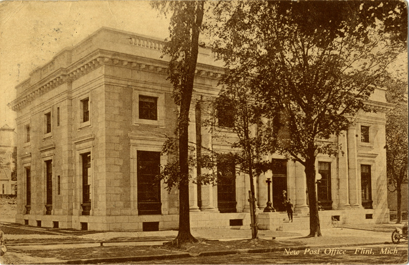 View of the U.S. Post Office and Y.M.C.A. building in Flint, Michigan. Printed on front: "New Post Office, Flint, Mich." Handwritten on back: "8/9/12. Dear Papa, Exams were not very hard yesterday. Am at Aunt [undecipherable]. Having a good time, too. Ettie." Card is postmarked August 9, 1912.
