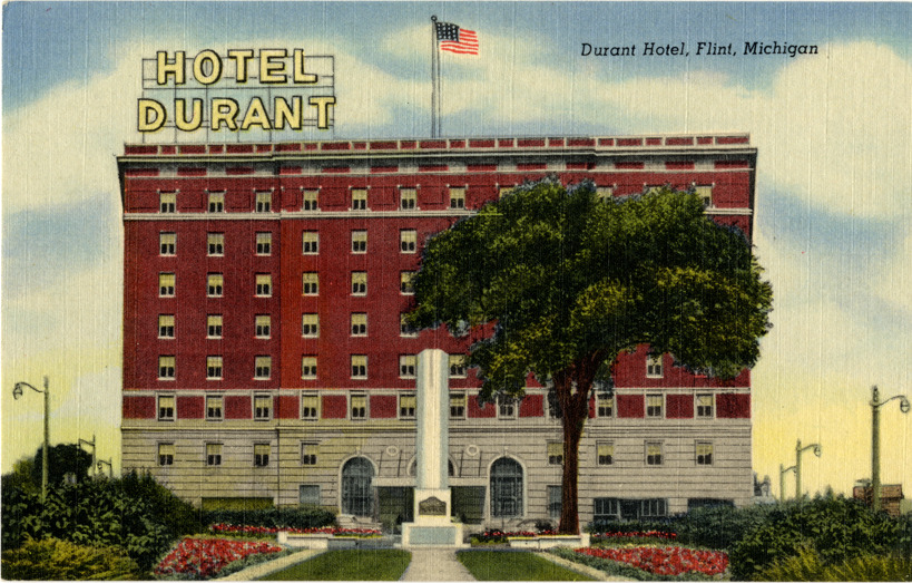 View of the Hotel Durant in Flint, Michigan. Printed on front: "Durant Hotel, Flint, Michigan." Printed on back: "In foreground is the Genesee County Memorial of World War II. Lovegrove's Wholesale, Inc., Flint 3, Michigan. Genuine Curteich-Chicago 'C.T. Art-Colortone' post card (reg. U.S. Pat. Off.)"
