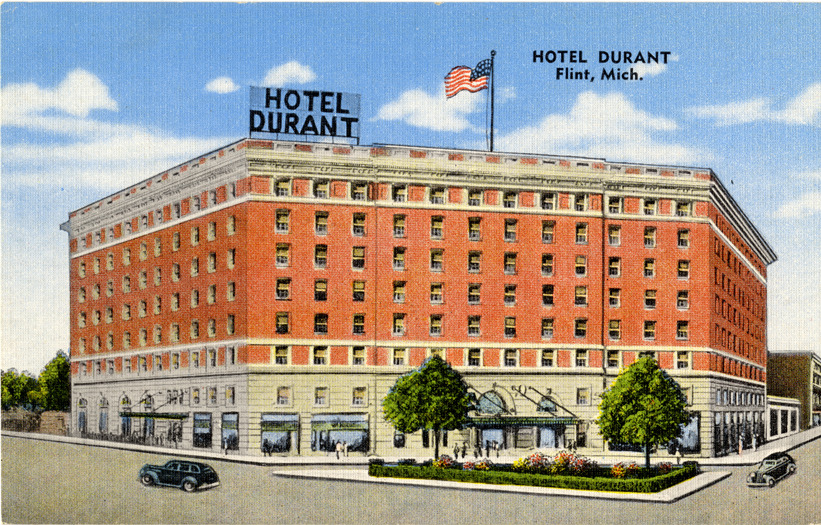 View of the Hotel Durant in Flint, Michigan. Printed on front: "Hotel Durant, Flint, Mich." Printed on back: "Durant Hotel on U.S. Highways 10 and 23. 300 beautiful outside rooms each with private bath. Newly refurnished and redecorated. One of Michigan's finest hotels. Famous Purple Cow coffee shop and Auto Lounge. Cocktail bar. A "Natural color card' made by E.C. Kropp Co., Milwaukee, Wis. - KHL. Albert Pick Hotels, always the best for every guest."