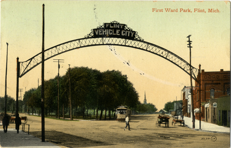 View of Flint Vehicle City arch in front of First Ward Park in Flint, Michigan. Printed on front: "First Ward Park, Flint, Mich." Printed on back: "F.M. Kirby & Co., Flint, Mich. Printed in Great Britain." Handwritten on back: "Hello Mom, I thought that I wood [sic] write and tell you that I entered to com [sic] home in about three weeks. By by, from Mildred." Card is postmarked May 14, 1910.