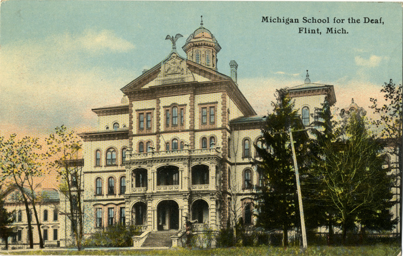 View of the Michigan School for the Deaf in Flint, Michigan. Printed on front: "Michigan School for the Deaf, Flint, Mich." Handwritten on back: "Dear Mother Newton, if nothing happens we want to come out to attend Mrs. Thompson's funeral so will be home some time Sat. night if we don't come on train will drive and it may be quite late before we get there. Addie N." Card is postmarked June 6, 1918.