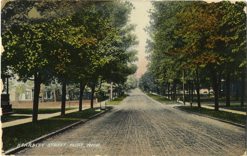View of tree-lined Kearsley St. in Flint, Michigan. Printed on front: "Kearsley Street. Flint, Mich." Printed on back: "SL & Co. Printed in Germany." Handwritten on back: "Friday morn. I arrived home safely & am well and hope you are all usually well. Will has gone to Dr. this morning to see what has gone wrong with his throat. Have no word from Ella yet. Mrs. R.B.E." Card is postmarked October 8, 1909.