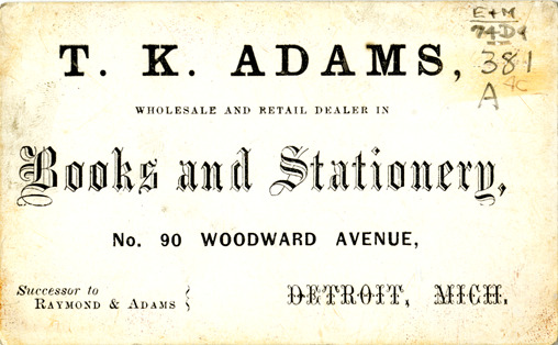 View of a business card for T.K. Adams, books and stationery. Printed on front: "T.K. Adams, wholesale and retail dealer in books and stationery, no. 90 Woodward Avenue, Detroit, Mich. Successor to Raymond & Adams."