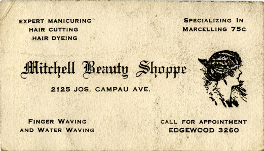 View of a business card for Mitchell Beauty Shoppe. Printed on front: "Mitchell Beauty Shoppe, 2125 Jos. Campau Ave. Expert manicuring, hair cutting, hair dyeing. Specializing in Marcelling, 75 [cents]. Finger waving and water waving. Call for appointment, Edgewood 3260."