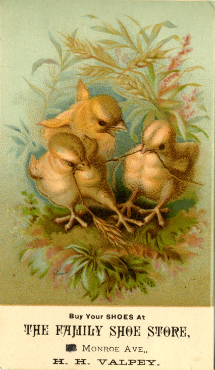H.H. Valpey shoe store advertising card Description: View of an advertising card for the H.H. Valpey shoe store, depicting three chicks. Printed on front: "Buy your shoes at the family shoe store, Monroe Ave., H.H. Valpey." Details Resource ID: bh013255 Subject: Shoe stores--Michigan--Detroit Birds in art Advertising--Shoes Advertising cards Date Issued: Unknown year Format: 1 advertising card : col. ; 5 x 3 in. Member of: Burton Historical Collection Filing Location: E&M 977.4D4 381 V Rights: Physical rights are retained by DPL. Copyright is retained in accordance with U.S. copyright laws.