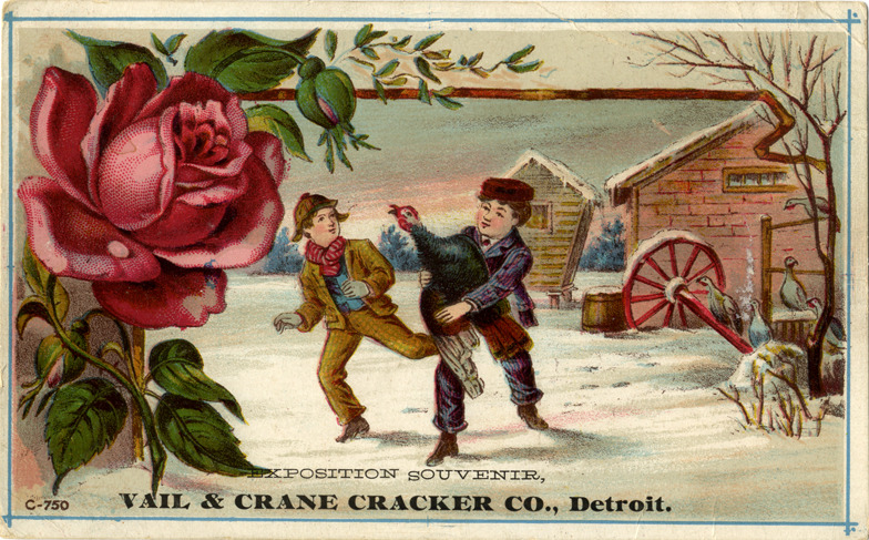 Favorite this☆ Vail & Crane Cracker Company advertising card Description: View of an advertising card for the Vail & Crane Cracker Company, depicting two boys on a farm with a turkey. Rose in foreground. Printed on front: "Exposition souvenir, Vail & Crane Cracker Co., Detroit." Details Resource ID: bh013258 Subject: Cracker industry--Michigan--Detroit Boys in art Roses in art Advertising cards Date Issued: Unknown year Format: 1 advertising card : col. ; 3.25 x 5.25 in. Member of: Burton Historical Collection Filing Location: E&M 977.4D4 381 V Rights: Physical rights are retained by DPL. Copyright is retained in accordance with U.S. copyright laws.