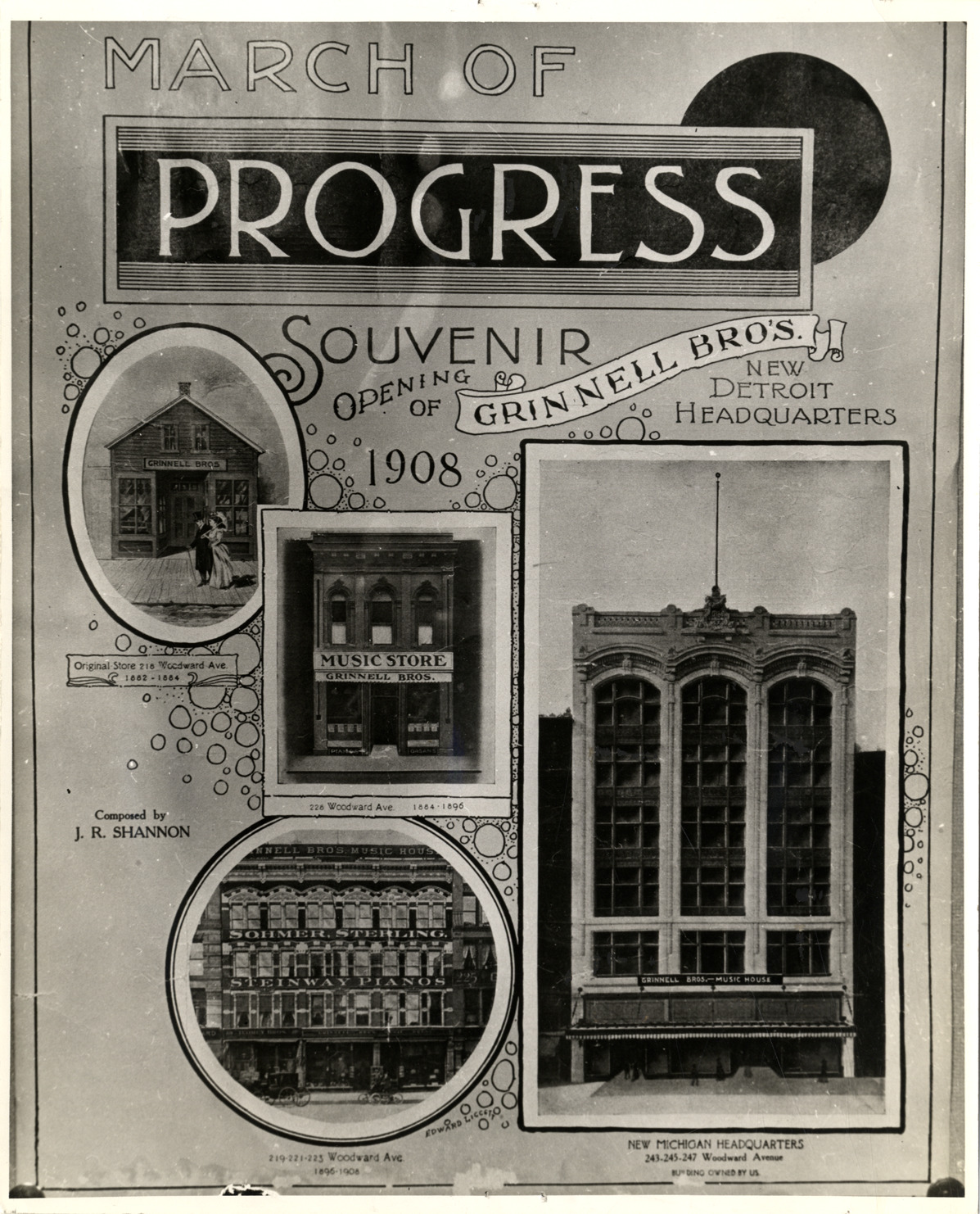 Reproduction of sheet music cover announcing the 1908 opening of Grinnell Bros. music store. Includes inset drawings and photographs of various locations. Printed on front: "March of progress, souvenir, opening of Grinnell Bro's. new Detroit headquarters, 1908. Original store, 218 Woodward Ave., 1882-1884; 228 Woodward Ave., 1884-1896; 219-221-223 Woodward Ave., 1896-1908; new Michigan headquarters, 243-245-247 Woodward Avenue, building owned by us. Composed by J.R. Shannon."